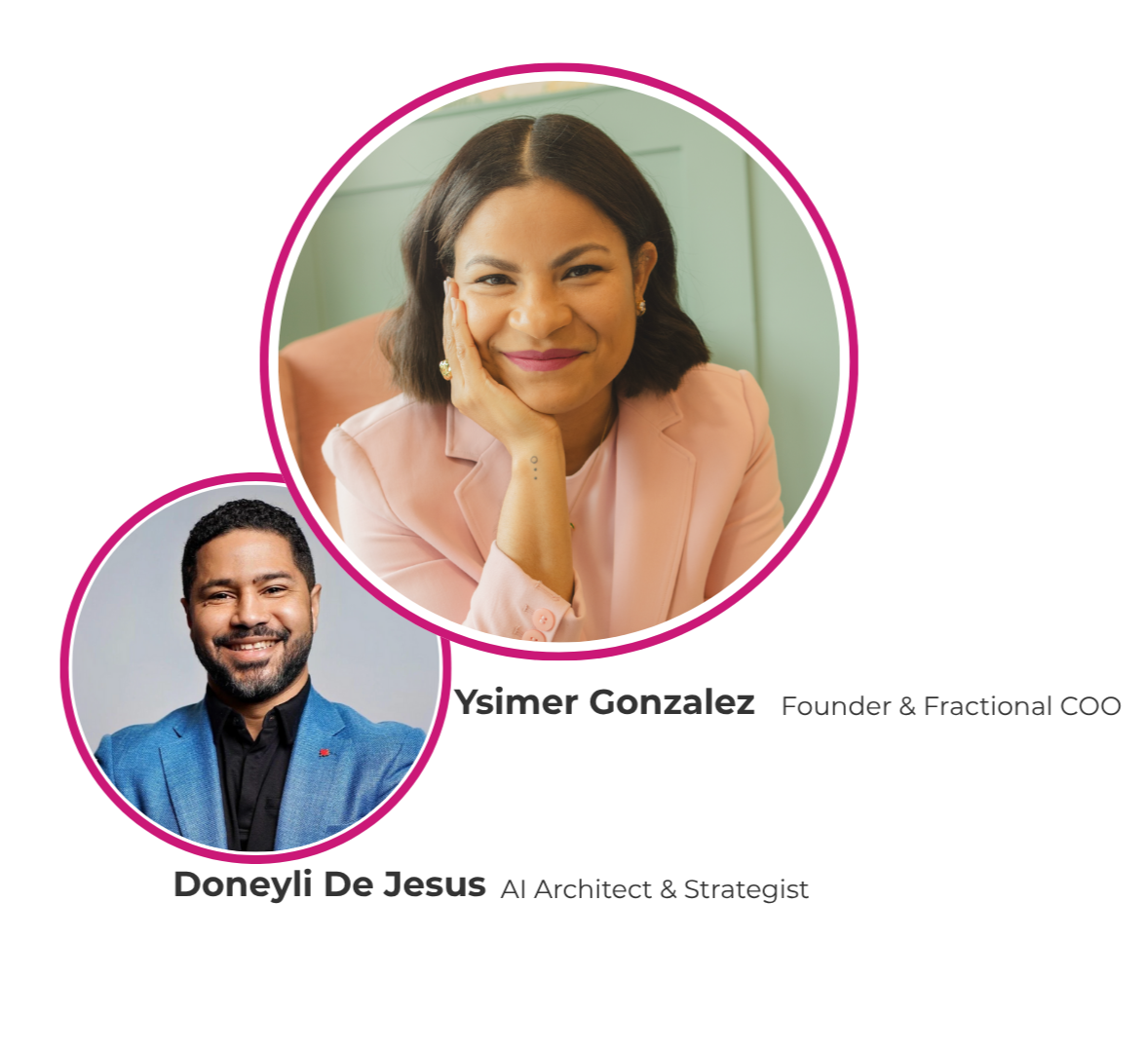 A professional headshot of a woman with shoulder-length dark hair, wearing a pink blazer, smiling and resting her chin on her hand. Below is a smaller headshot of a man with short dark hair and a beard, wearing a blue blazer and black shirt, also smiling. The woman is labeled Ysimer Gonzalez, Founder & Fractional COO, and the man is labeled Doneyli De Jesus, AI Architect & Strategist.